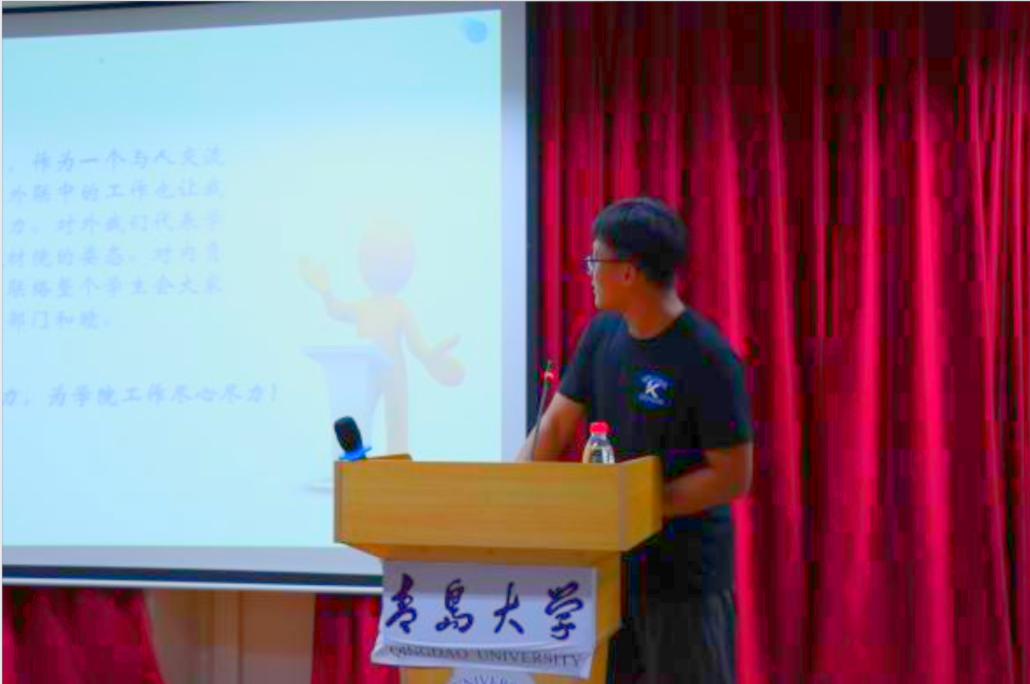 大会第二项,由第八届学生会主席李峰发言。李峰首先向新一届学生会表示祝贺,又与全体成员分享了在过去一年学生会取得的优异成绩,感谢了各位领导的关怀、勉励和帮助以及学生会每一个成员的不懈努力,并向全体成员提出四点希望,并诚心祝愿新一届学生会在四点希望下共同创造更加辉煌璀璨的未来。
